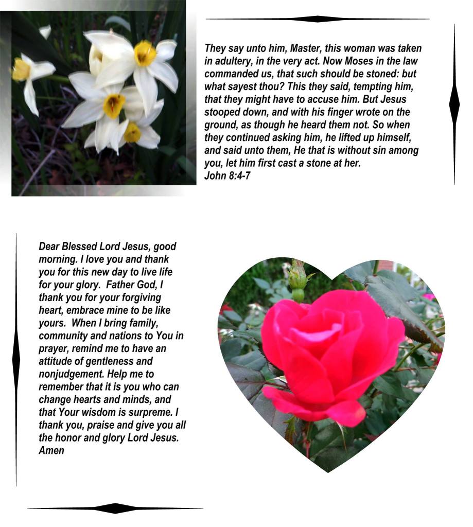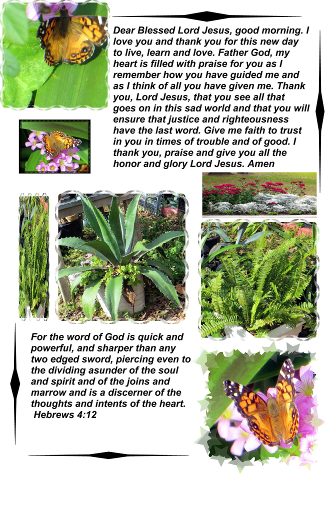 Dear Blessed Lord Jesus, good morning. I love you and thank you for this new day to live, learn and love. Father God, my heart is filled with praise for you as I remember how you have guided me and as I think of all you have given me. Thank you, Lord Jesus, that you see all that goes on in this sad world and that you will ensure that justice and righteousness have the last word. Give me faith to trust in you in times of trouble and of good. I thank you, praise and give you all the honor and glory Lord Jesus. Amen — For the word of God is quick and powerful, and sharper than any two edged sword, piercing even to the dividing asunder of the soul and spirit and of the joins and marrow and is a discerner of the thoughts and intents of the heart. Hebrews 4:12