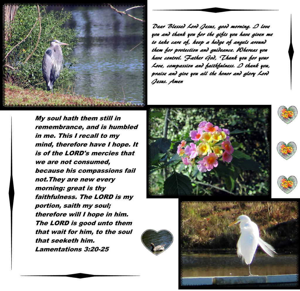 Dear Blessed Lord Jesus, good morning. I love you and thank you for this new day to breathe. Father God, everything you made you give breath to. It is so amazing. Seeds planted in the ground don’t have a choice. They grow beautifully, then die. But you have a purpose for everyone and everything. What fly’s, swim’s and what walks that is not planted in the ground you gave right to choose right from wrong. You are so awesome. Thank you for the beauty in people, nature and all around us. Thank you for choices. Help all of us be alert for the surprises in nature, from colors, shapes and just the beauty in everything whether it breathes or not. All the talents made from your hands to ours. Help us today to enjoy and appreciate one aothers insights, abilities and laughter. I thank you, praise and give you all the honor and glory Lord Jesus. Amen. — And God said, Let us make man in our image, after our likeness: and let them have dominion over the fish of the sea, and over the fowl of the air, and over the cattle, and over all the earth, and over every creeping thing that creepeth upon the earth. So God created man in his own image, in the image of God created he him; male and female created he them. And God blessed them, and God said unto them, Be fruitful, and multiply, and replenish the earth, and subdue it: and have dominion over the fish of the sea, and over the fowl of the air, and over every living thing that moveth upon the earth. And God said, Behold, I have given you every herb bearing seed, which is upon the face of all the earth, and every tree, in the which is the fruit of a tree yielding seed; to you it shall be for meat. And to every beast of the earth, and to every fowl of the air, and to every thing that creepeth upon the earth, wherein there is life, I have given every green herb for meat: and it was so. And God saw every thing that he had made, and, behold, it was very good. And the evening and the morning were the sixth day. Genesis 1:26-31
