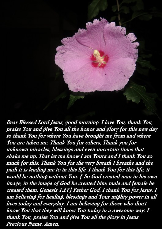 Dear Blessed Lord Jesus, good morning. I love You, thank You, praise You and give You all the honor and glory for this new day to thank You for where You have brought me from and where You are taken me. Thank You for others, Thank you for unknown miracles, blessings and even uncertain times that shake me up. That let me know I am Yours and I thank You so much for this. Thank You for the very breath I breathe and the path it is leading me to in this life. I thank You for this life, it would be nothing without You. { So God created man in his own image, in the image of God he created him; male and female he created them. Genesis 1:27} Father God, I thank You for Jesus. I am believing for healing, blessings and Your mighty power in all lives today and everyday. I am believing for those who don’t know You that they will know You today in a awesome way. I thank You, praise You and give You all the glory in Jesus Precious Name. Amen.
