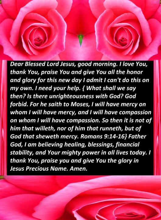 Dear Blessed Lord Jesus, good morning. I love You, thank You, praise You and give You all the honor and glory for this new day I admit I can’t do this on my own. I need your help. { What shall we say then? Is there unrighteousness with God? God forbid. For he saith to Moses, I will have mercy on whom I will have mercy, and I will have compassion on whom I will have compassion. So then it is not of him that willeth, nor of him that runneth, but of God that sheweth mercy. Romans 9:14-16} Father God, I am believing healing, blessings, financial stability, and Your mighty power in all lives today. I thank You, praise you and give You the glory in Jesus Precious Name. Amen.