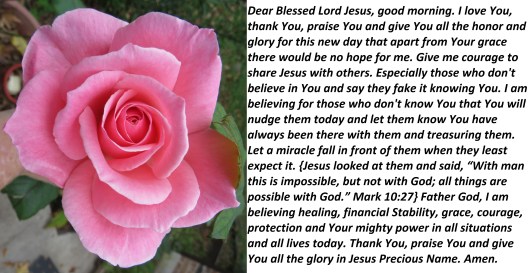 Dear Blessed Lord Jesus, good morning. I love You, thank You, praise You and give You all the honor and glory for this new day that apart from Your grace there would be no hope for me. Give me courage to share Jesus with others. Especially those who don’t believe in You and say they fake it knowing You. I am believing for those who don’t know You that You will nudge them today and let them know You have always been there with them and treasuring them. Let a miracle fall in front of them when they least expect it. {Jesus looked at them and said, “With man this is impossible, but not with God; all things are possible with God.”