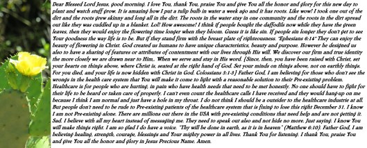 Dear Blessed Lord Jesus, good morning. I love You, thank You, praise You and give You all the honor and glory for this new day to plant and watch stuff grow. It is amazing how I put a tulip bulb in water a week ago and it has roots. Like wow! I took one out of the dirt and the roots grew skinny and long all in the dirt. The roots in the water stay in one community and the roots in the dirt spread out like they was cuddled up in a blanket. Lol! How awesome! I think if people bought the daffodils now while they have the green leaves, then they would enjoy the flowering time longer when they bloom. Guess it is like sin. If people sin longer they don’t get to see Your goodness the way life is to be. But if they stand firm with the breast plate of righteousness. “Ephesians 6:14” They can enjoy the beauty of flowering in Christ. God created us humans to have unique characteristics, beauty and purpose. However he designed us also to have a sharing of features or attributes of contentment with our lives through His will. We discover our firm and true identity the more closely we are drawn near to Him,. When we serve and stay in His word. {Since, then, you have been raised with Christ, set your hearts on things above, where Christ is, seated at the right hand of God. Set your minds on things above, not on earthly things. For you died, and your life is now hidden with Christ in God. Colossians 3:1-3} Father God, I am believing for those who don’t see the wrongs in the health care system that You will make it come to light with a reasonable solution to their Pre-existing problem. Healthcare is for people who are hurting, in pain who have health needs that need to be met honestly. No one should have to fight for their life to be heard or taken care of properly. I can’t even count the healthcare calls I have received and they would hang-up on me because I think I am normal and just have a hole in my throat. I do not think I should be a outsider to the healthcare industrie at all. But people don’t need to be rude to Pre-existing patients of the healthcare system that is fixing to lose this right December 31. I know I am not Pre-existing alone. There are millions out there in the USA with pre-existing conditions that need help and are not getting it. Sad. I believe with all my heart instead of messaging me. They need to speak out also and not hide no more. Just saying. I know You will make things right. I am so glad I do have a voice. “Thy will be done in earth, as it is in heaven” (Matthew 6:10). Father God, I am believing healing, strength, courage, blessings and Your mighty power in all lives. Thank You for listening. I thank You, praise You and give You all the honor and glory in Jesus Precious Name. Amen.