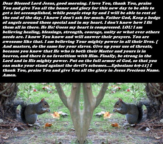 Dear Blessed Lord Jesus, good morning. I love You, thank You, praise You and give You all the honor and glory for this new day to be able to get a lot accomplished, while people stop by and I will be able to rest at the end of the day. I know I don’t ask for much. Father God, Keep a hedge of angels around those special and in my heart. I don’t know how I fit them all in there. He He! Guess my heart is compressed. LOL! I am believing healing, blessings, strength, courage, unity or what ever others needs are. I know You know and will answer their prayers. You are awesome like that. I am believing Your mighty power in all their lives. { And masters, do the same for your slaves. Give up your use of threats, because you know that He who is both their Master and yours is in heaven, and there is no favoritism with Him. Finally, be strong in the Lord and in His mighty power. Put on the full armor of God, so that you can make your stand against the devil’s schemes.…Ephesians 6:9-11} I thank You, praise You and give You all the glory in Jesus Precious Name. Amen.