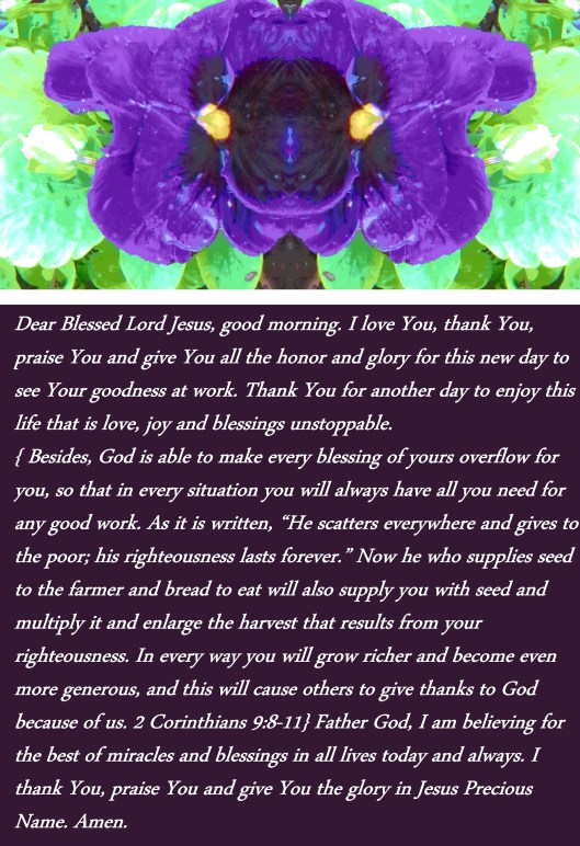 Dear Blessed Lord Jesus, good morning. I love You, thank You, praise You and give You all the honor and glory for this new day to see Your goodness at work. Thank You for another day to enjoy this life that is love, joy and blessings unstoppable.
