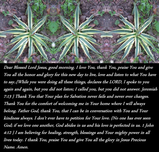 Dear Blessed Lord Jesus, good morning. I love You, thank You, praise You and give You all the honor and glory for this new day to live, love and listen to what You have to say..{While you were doing all these things, declares the LORD, I spoke to you again and again, but you did not listen; I called you, but you did not answer. Jeremiah 7:13 } Thank You that Your plan for Salvation never fails and never ever changes. Thank You for the comfort of welcoming me in Your home where I will always belong. Father God, thank You, that I can be in conversation with You and Your kindness always. I don’t ever have to petition for Your love. {No one has ever seen God; if we love one another, God abides in us and his love is perfected in us. 1 John 4:12 } I am believing for healing, strength, blessings and Your mighty power in all lives today. I thank You, praise You and give You all the glory in Jesus Precious Name. Amen.