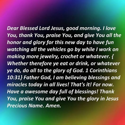 Dear Blessed Lord Jesus, good morning. I love You, thank You, praise You, and give You all the honor and glory for this new day to have fun watching all the vehicles go by while I work on making more jewelry, crochet or whatever. { Whether therefore ye eat or drink, or whatever ye do, do all to the glory of God. 1 Corinthians 10:31} Father God, I am believing blessings and miracles today in all lives! That’s it! For now. Have a awesome day full of blessings! Thank You, praise You and give You the glory in Jesus Precious Name. Amen.
