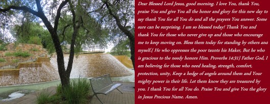 Dear Blessed Lord Jesus, good morning. I love You, thank You, praise You and give You all the honor and glory for this new day to say thank You for all You do and all the prayers You answer. Some sure can be surprising. I am so blessed today! Thank You and thank You for those who never give up and those who encourage me to keep moving on. Bless them today for standing by others and myself.{ He who oppresses the poor taunts his Maker, But he who is gracious to the needy honors Him. Proverbs 14:31} Father God, I am believing for those who need healing, strength, comfort, protection, unity, Keep a hedge of angels around them and Your mighty power in their life. Let them know they are treasured by you. I thank You for all You do. Praise You and give You the glory in Jesus Precious Name. Amen