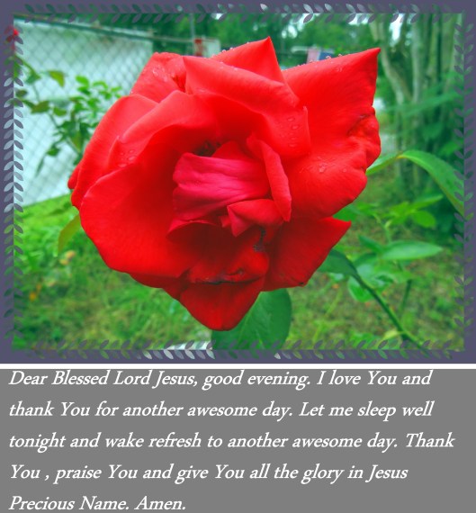 Dear Blessed Lord Jesus, good evening. I love You and thank You for another awesome day. Let me sleep well tonight and wake refresh to another awesome day. Thank You , praise You and give You all the glory in Jesus Precious Name. Amen.
