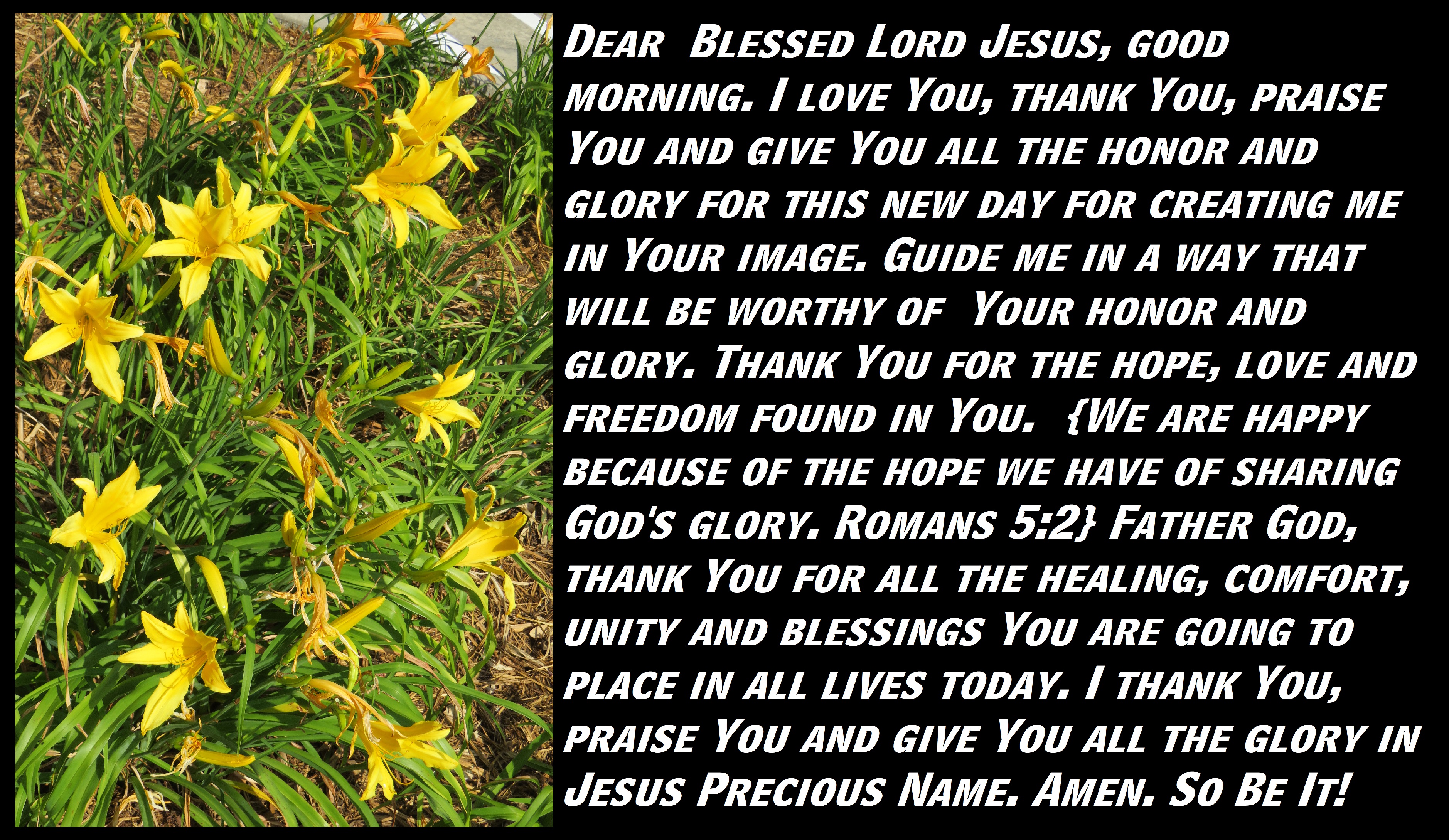 Dear Blessed Lord Jesus, good morning. I love You, thank You, praise You and give You all the honor and glory for this new day for creating me in Your image. Guide me in a way that will be worthy of Your honor and glory. Thank You for the hope, love and freedom found in You. {We are happy because of the hope we have of sharing God’s glory. Romans 5:2} Father God, thank You for all the healing, comfort, unity and blessings You are going to place in all lives today. I thank You, praise You and give You all the glory in Jesus Precious Name. Amen. So Be It!