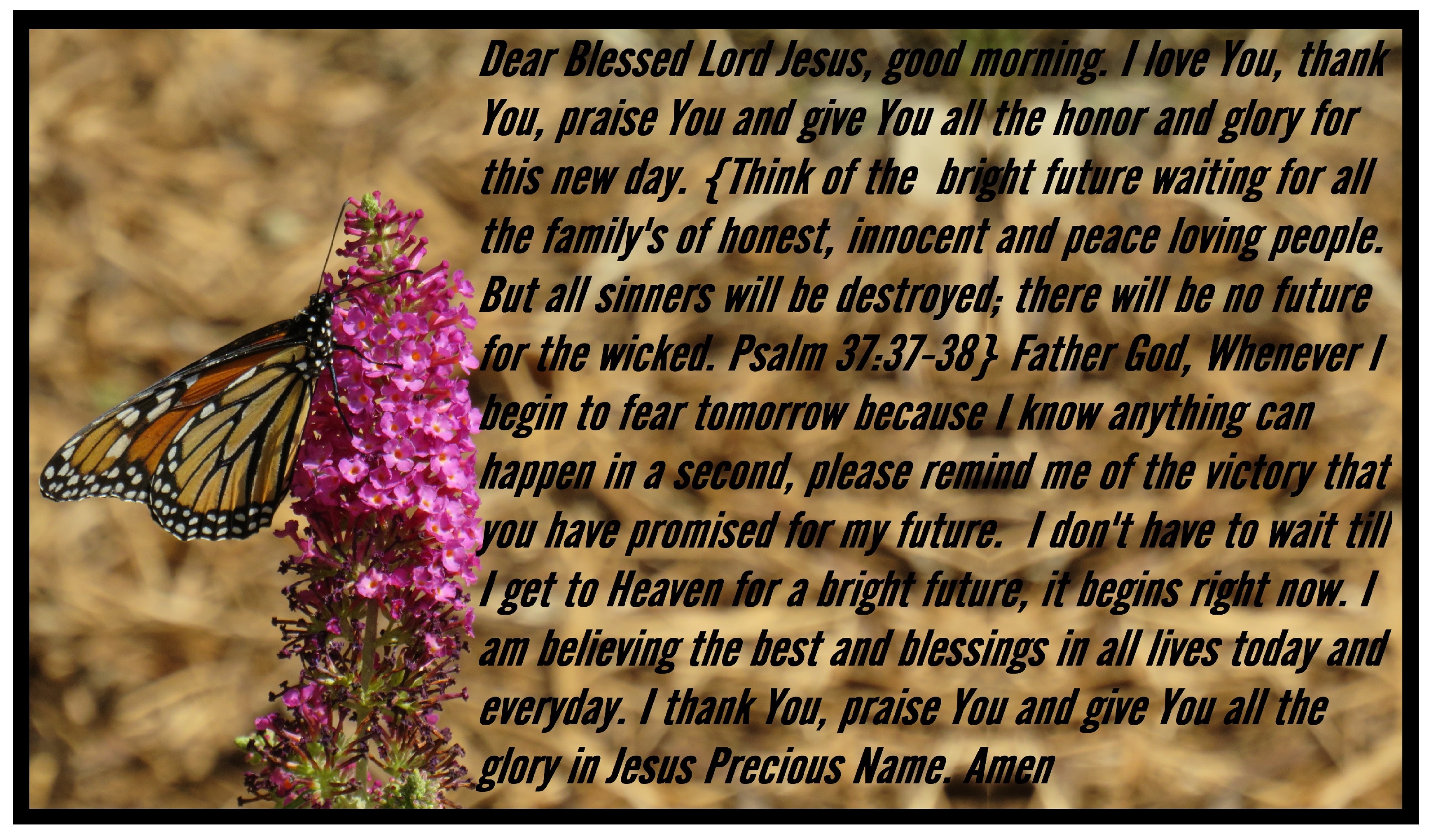 Dear Blessed Lord Jesus, good morning. I love You, thank You, praise You and give You all the honor and glory for this new day. {Think of the bright future waiting for all the family’s of honest, innocent and peace loving people. But all sinners will be destroyed; there will be no future for the wicked. Psalm 37:37-38} Father God, Whenever I begin to fear tomorrow because I know anything can happen in a second, please remind me of the victory that you have promised for my future. I don’t have to wait till I get to Heaven for a bright future, it begins right now. I am believing the best and blessings in all lives today and everyday. I thank You, praise You and give You all the glory in Jesus Precious Name. Amen