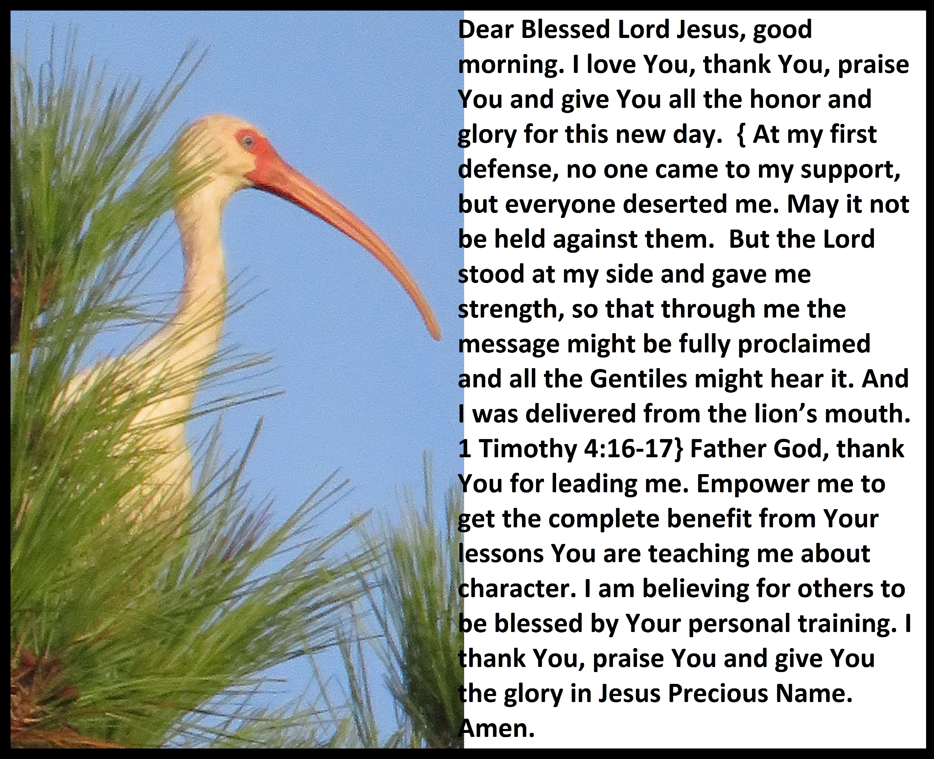 Dear Blessed Lord Jesus, good morning. I love You, thank You, praise You and give You all the honor and glory for this new day. { At my first defense, no one came to my support, but everyone deserted me. May it not be held against them. But the Lord stood at my side and gave me strength, so that through me the message might be fully proclaimed and all the Gentiles might hear it. And I was delivered from the lion’s mouth. 1 Timothy 4:16-17} Father God, thank You for leading me. Empower me to get the complete benefit from Your lessons You are teaching me about character. I am believing for others to be blessed by Your personal training. I thank You, praise You and give You the glory in Jesus Precious Name. Amen.