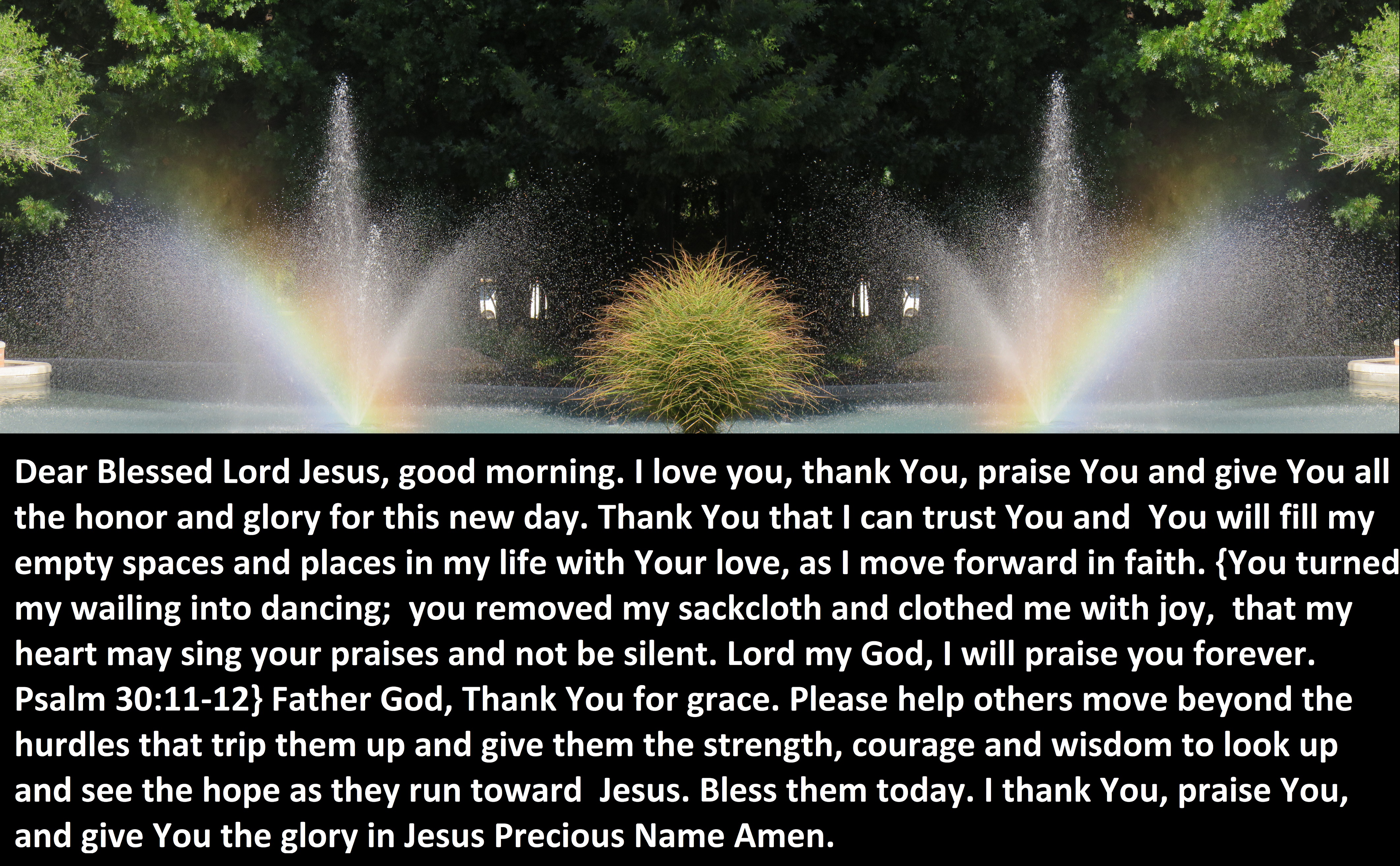 Dear Blessed Lord Jesus, good morning. I love you, thank You, praise You and give You all the honor and glory for this new day. Thank You that I can trust You and You will fill my empty spaces and places in my life with Your love, as I move forward in faith. {You turned my wailing into dancing; you removed my sackcloth and clothed me with joy, that my heart may sing your praises and not be silent. Lord my God, I will praise you forever. Psalm 30:11-12} Father God, Thank You for grace. Please help others move beyond the hurdles that trip them up and give them the strength, courage and wisdom to look up and see the hope as they run toward Jesus. Bless them today. I thank You, praise You, and give You the glory in Jesus Precious Name Amen.