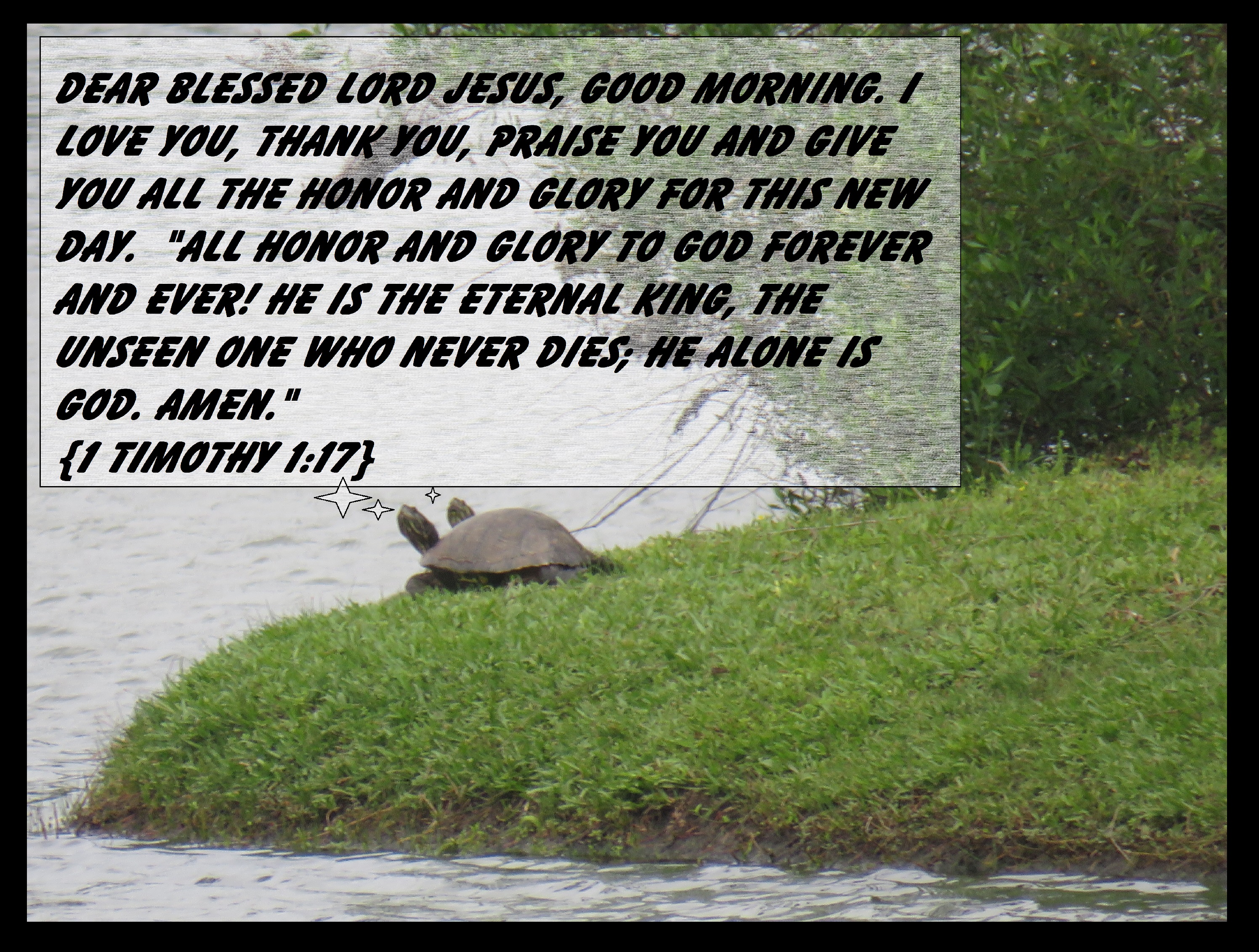 Dear Blessed Lord Jesus, good morning. I love You, thank You, praise You and give You all the honor and glory for this new day. “All honor and glory to God forever and ever! He is the eternal King, the unseen one who never dies; he alone is God. Amen.” {1 Timothy 1:17}