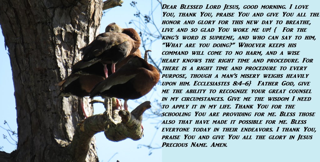 Dear Blessed Lord Jesus, good morning. I love You, thank You, praise You and give You all the honor and glory for this new day to breathe, live and so glad You woke me up! { For the king’s word is supreme, and who can say to him, “What are you doing?” Whoever keeps his command will come to no harm, and a wise heart knows the right time and procedure. For there is a right time and procedure to every purpose, though a man’s misery weighs heavily upon him. Ecclesiastes 8:4-6} Father God, give me the ability to recognize your great counsel in my circumstances. Give me the wisdom I need to apply it in my life. Thank You for the schooling You are providing for me. Bless those also that have made it possible for me. Bless everyone today in their endeavors. I thank You, praise You and give You all the glory in Jesus Precious Name. Amen.