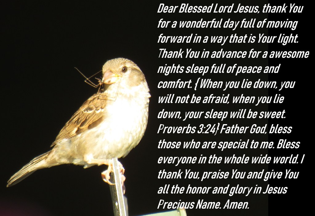 Dear Blessed Lord Jesus, thank You for a wonderful day full of moving forward in a way that is Your light. Thank You in advance for a awesome nights sleep full of peace and comfort. { When you lie down, you will not be afraid, when you lie down, your sleep will be sweet. Proverbs 3:24} Father God, bless those who are special to me. Bless everyone in the whole wide world. I thank You, praise You and give You all the honor and glory in Jesus Precious Name. Amen.