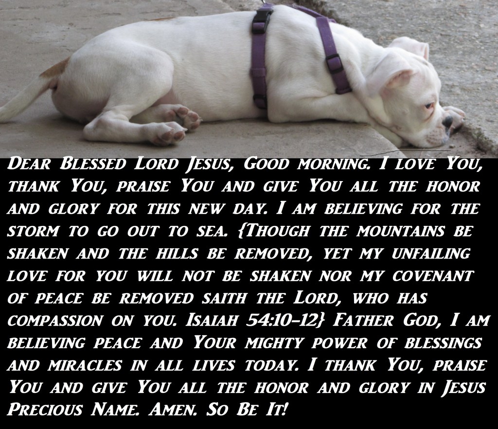 Dear Blessed Lord Jesus, Good morning. I love You, thank You, praise You and give You all the honor and glory for this new day. I am believing for the storm to go out to sea. {Though the mountains be shaken and the hills be removed, yet my unfailing love for you will not be shaken nor my covenant of peace be removed saith the Lord, who has compassion on you. Isaiah 54:10-12} Father God, I am believing peace and Your mighty power of blessings and miracles in all lives today. I thank You, praise You and give You all the honor and glory in Jesus Precious Name. Amen. So Be It!