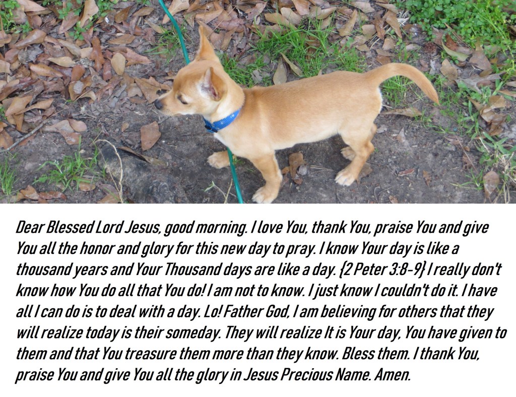 Dear Blessed Lord Jesus, good morning. I love You, thank You, praise You and give You all the honor and glory for this new day to pray. I know Your day is like a thousand years and Your Thousand days are like a day. {2 Peter 3:8-9} I really don’t know how You do all that You do! I am not to know. I just know I couldn’t do it. I have all I can do is to deal with a day. Lo! Father God, I am believing for others that they will realize today is their someday. They will realize It is Your day, You have given to them and that You treasure them more than they know. Bless them. I thank You, praise You and give You all the glory in Jesus Precious Name. Amen.