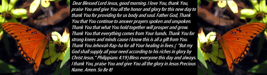 Dear Blessed Lord Jesus, good morning. I love You, thank You, praise You and give You all the honor and glory for this new day to thank You for providing for us body and soul. Father God, Thank You that You continue to answer prayers spoken and unspoken. Thank You that what You hold together will prosper and grow. Thank You that everything comes from Your hands. Thank You for strong knees and minds cause I know this is all a gift from You. Thank You Jehovah Rap-ha for all Your healing in lives.{ “But my God shall supply all your need according to his riches in glory by Christ Jesus.” Philippians 4:19}Bless everyone this day and always. I thank You, praise You and give You all the glory in Jesus Precious Name. Amen. So Be It!