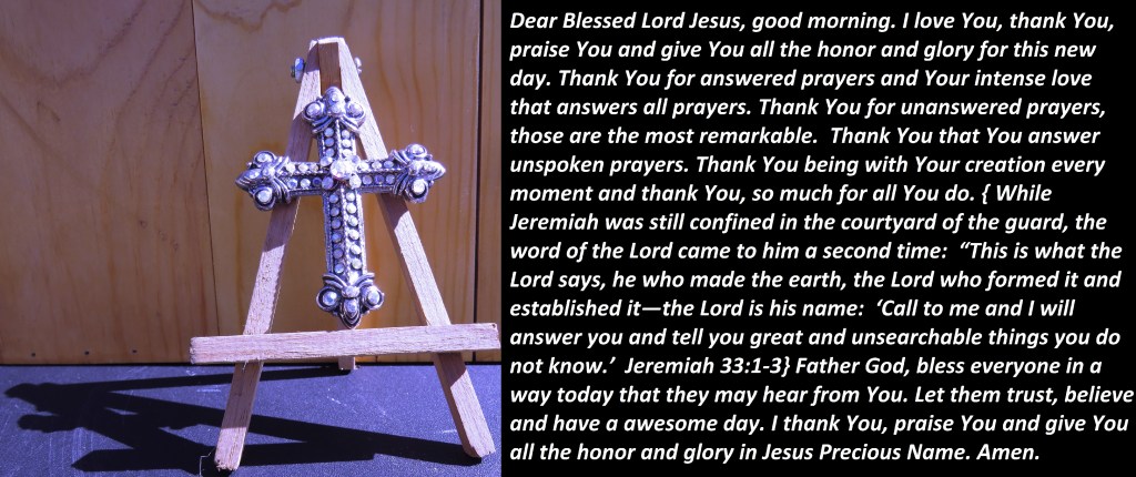 Dear Blessed Lord Jesus, good morning. I love You, thank You, praise You and give You all the honor and glory for this new day. Thank You for answered prayers and Your intense love that answers all prayers. Thank You for unanswered prayers, those are the most remarkable. Thank You that You answer unspoken prayers. Thank You being with Your creation every moment and thank You, so much for all You do. { While Jeremiah was still confined in the courtyard of the guard, the word of the Lord came to him a second time: “This is what the Lord says, he who made the earth, the Lord who formed it and established it—the Lord is his name: ‘Call to me and I will answer you and tell you great and unsearchable things you do not know.’ Jeremiah 33:1-3} Father God, bless everyone in a way today that they may hear from You. Let them trust, believe and have a awesome day. I thank You, praise You and give You all the honor and glory in Jesus Precious Name. Amen.