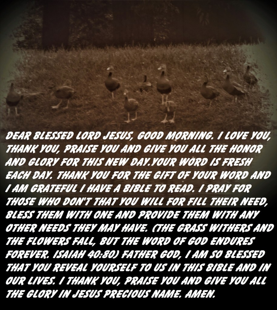 Dear Blessed Lord Jesus, good morning. I love You, thank You, praise You and give You all the honor and glory for this new day.Your word is fresh each day. Thank You for the gift of Your word and I am grateful I have a bible to read. I pray for those who don’t, that You will for fill their need, bless them with one and provide them with any other needs they may have. (The grass withers and the flowers fade, but the word of God endures forever. Isaiah 40:80) Father God, I am so blessed that You reveal Yourself to us in this bible and in our lives. I thank You, praise You and give You all the glory in Jesus Precious Name. Amen.