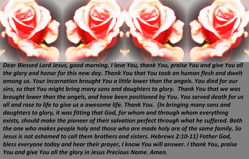 Dear Blessed Lord Jesus, good morning. I love You, thank You, praise You and give You all the glory and honor for this new day. Thank You that You took on human flesh and dwelt among us. Your incarnation brought You a little lower than the angels. You died for our sins, so that You might bring many sons and daughters to glory. Thank You that we was brought lower than the angels, and have been positioned by You. You served death for us all and rose to life to give us a awesome life. Thank You. {In bringing many sons and daughters to glory, it was fitting that God, for whom and through whom everything exists, should make the pioneer of their salvation perfect through what he suffered. Both the one who makes people holy and those who are made holy are of the same family. So Jesus is not ashamed to call them brothers and sisters. Hebrews 2:10-11} Father God, bless everyone today and hear their prayer, I know You will answer. I thank You, praise You and give You all the glory in Jesus Precious Name. Amen.