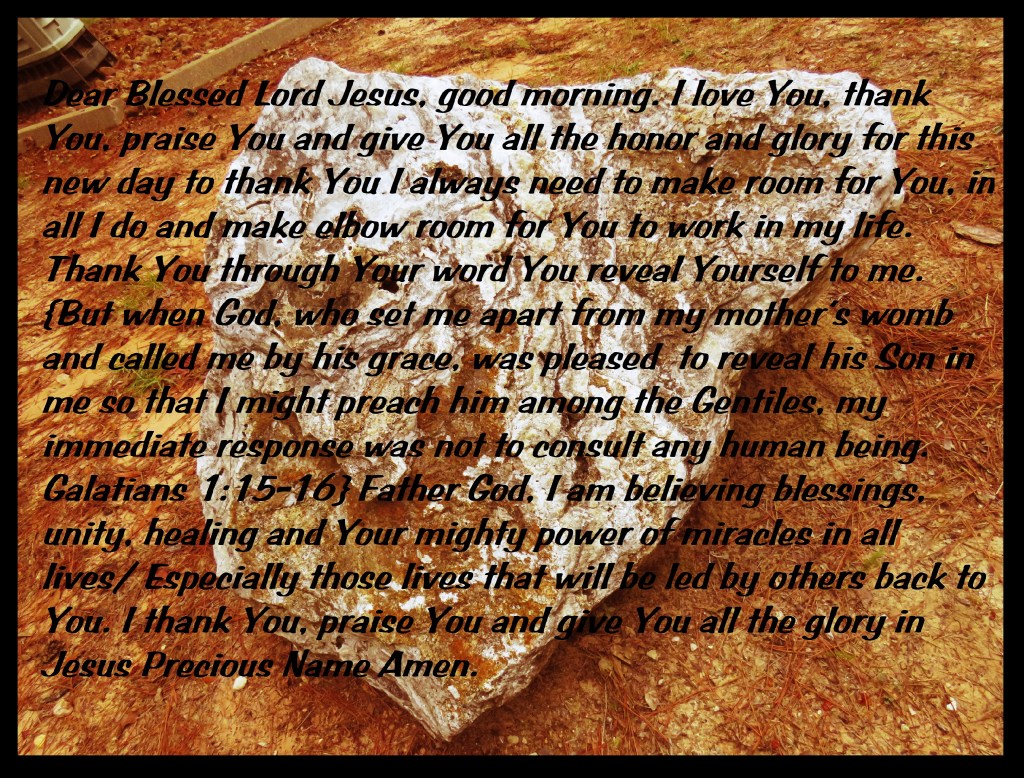 Dear Blessed Lord Jesus, good morning. I love You, thank You, praise You and give You all the honor and glory for this new day to thank You I always need to make room for You, in all I do and make elbow room for You to work in my life. Thank You through Your word You reveal Yourself to me. {But when God, who set me apart from my mother’s womb and called me by his grace, was pleased to reveal his Son in me so that I might preach him among the Gentiles, my immediate response was not to consult any human being. Galatians 1:15-16} Father God, I am believing blessings, unity, healing and Your mighty power of miracles in all lives. Especially those lives that will be led by others back to You. I thank You, praise You and give You all the glory in Jesus Precious Name Amen.