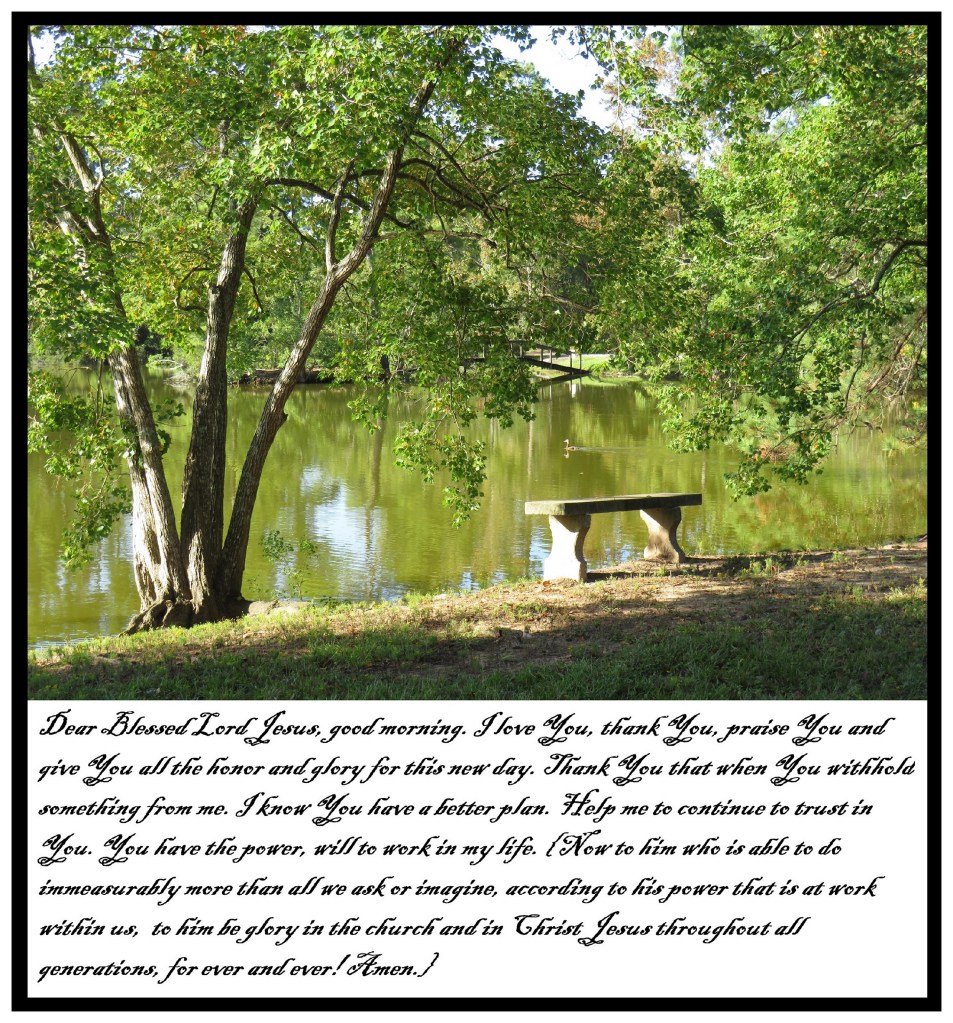 Dear Blessed Lord Jesus, good morning. I love You, thank You, praise You and give You all the honor and glory for this new day. Thank You that when You withhold something from me. I know You have a better plan. Help me to continue to trust in You. You have the power, will to work in my life. {Now to him who is able to do immeasurably more than all we ask or imagine, according to his power that is at work within us, to him be glory in the church and in Christ Jesus throughout all generations, for ever and ever! Amen.}