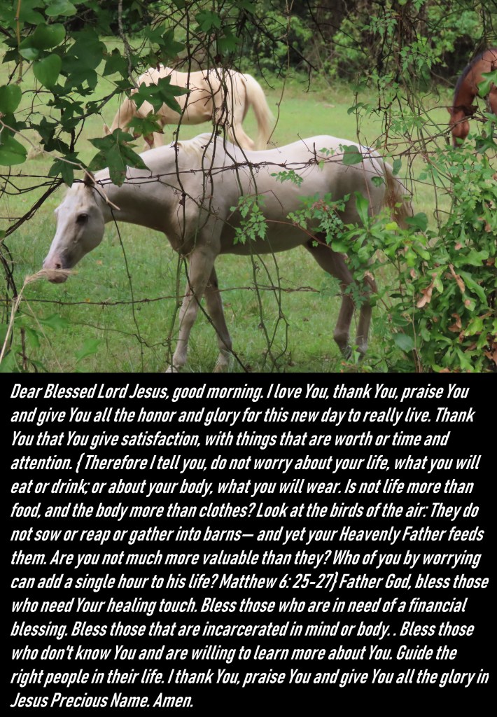 Dear Blessed Lord Jesus, good morning. I love You, thank You, praise You and give You all the honor and glory for this new day to really live. Thank You that You give satisfaction, with things that are worth or time and attention. { Therefore I tell you, do not worry about your life, what you will eat or drink; or about your body, what you will wear. Is not life more than food, and the body more than clothes? Look at the birds of the air: They do not sow or reap or gather into barns— and yet your Heavenly Father feeds them. Are you not much more valuable than they? Who of you by worrying can add a single hour to his life? Matthew 6: 25-27} Father God, bless those who need Your healing touch. Bless those who are in need of a financial blessing. Bless those that are incarcerated in mind or body. . Bless those who don’t know You and are willing to learn more about You. Guide the right people in their life. I thank You, praise You and give You all the glory in Jesus Precious Name. Amen.