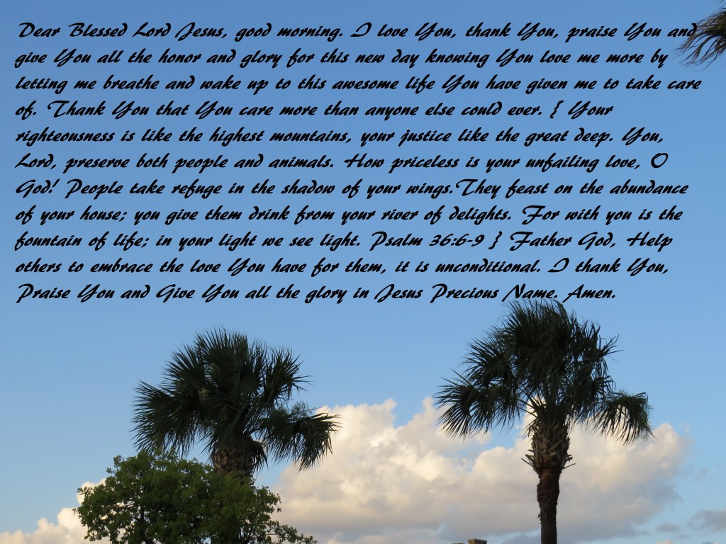 Dear Blessed Lord Jesus, good morning. I love You, thank You, praise You and give You all the honor and glory for this new day knowing You love me more by letting me breathe and wake up to this awesome life You have given me to take care of. Thank You that You care more than anyone else could ever. { Your righteousness is like the highest mountains, your justice like the great deep. You, Lord, preserve both people and animals. How priceless is your unfailing love, O God! People take refuge in the shadow of your wings.They feast on the abundance of your house; you give them drink from your river of delights. For with you is the fountain of life; in your light we see light. Psalm 36:6-9 } Father God, Help others to embrace the love You have for them, it is unconditional. I thank You, Praise You and Give You all the glory in Jesus Precious Name. Amen.