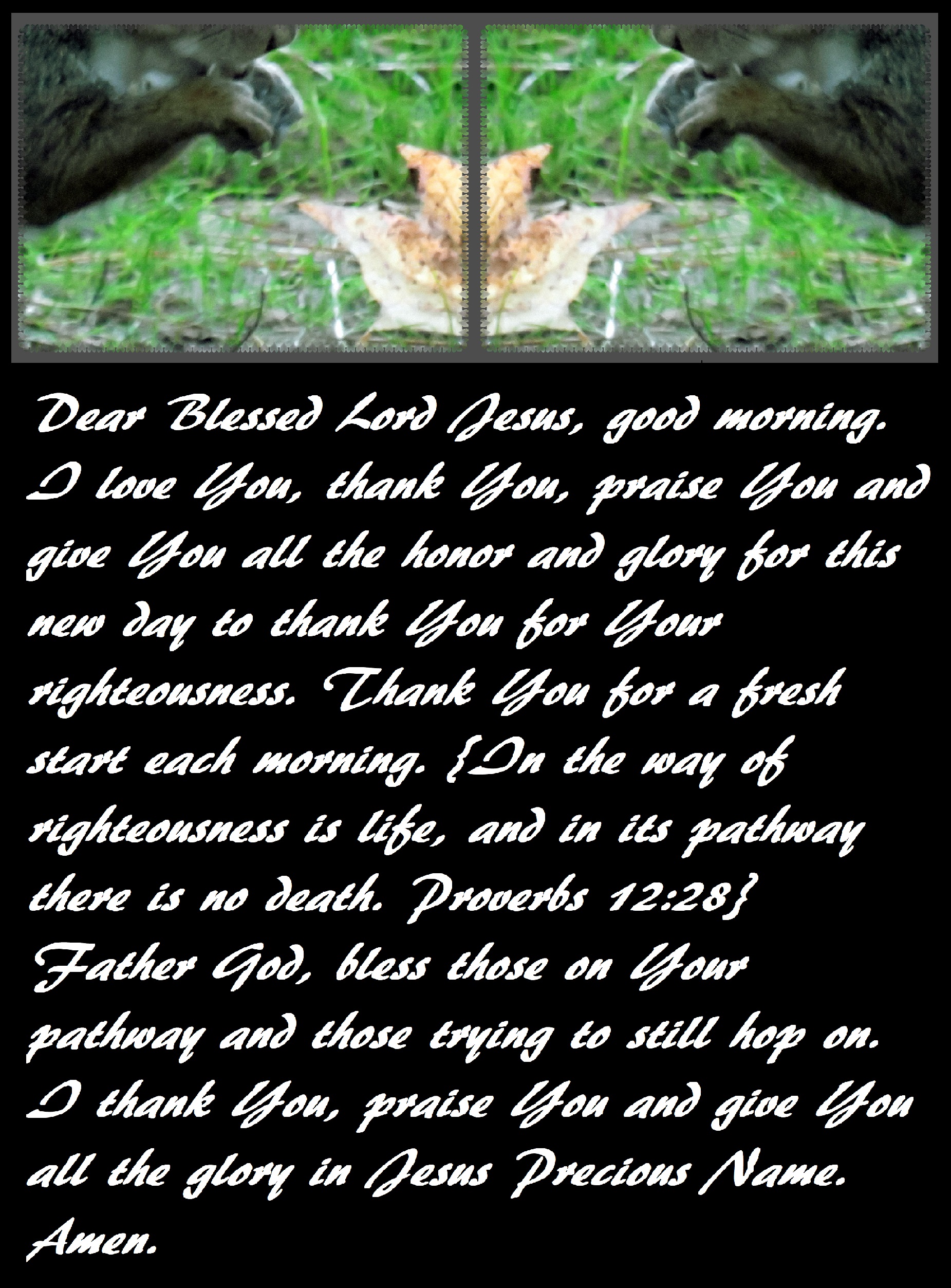 Dear Blessed Lord Jesus, good morning. I love You, thank You, praise You and give You all the honor and glory for this new day to thank You for Your righteousness. Thank You for a fresh start each morning. {In the way of righteousness is life, and in its pathway there is no death. Proverbs 12:28} Father God, bless those on Your pathway and those trying to still hop on. I thank You, praise You and give You all the glory in Jesus Precious Name. Amen.