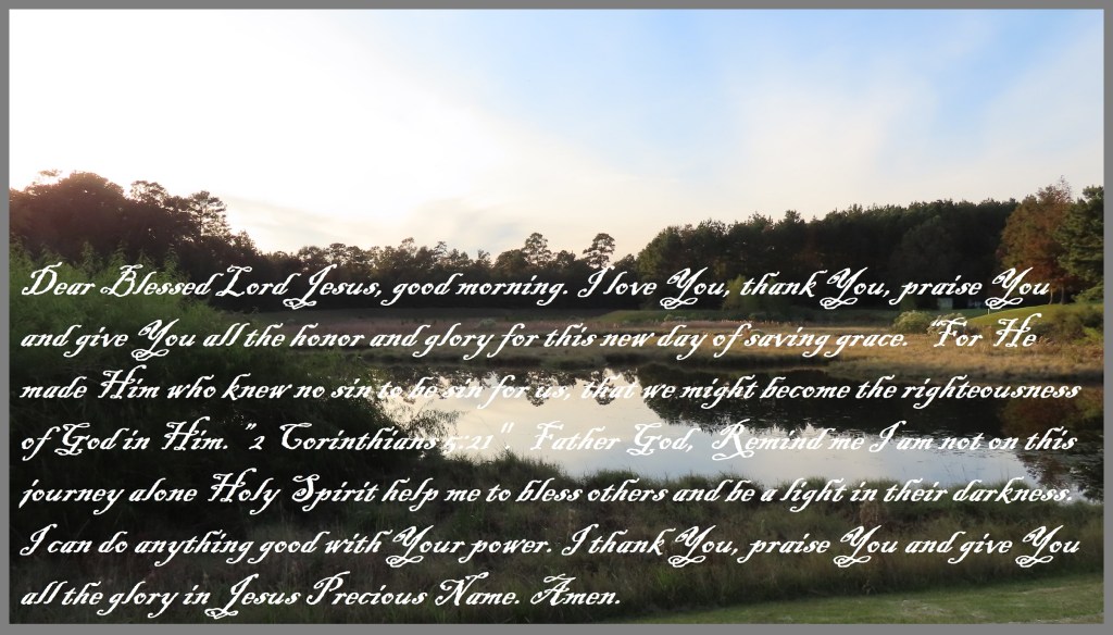 Dear Blessed Lord Jesus, good morning. I love You, thank You, praise You and give You all the honor and glory for this new day of saving grace. “For He made Him who knew no sin to be sin for us, that we might become the righteousness of God in Him.” 2 Corinthians 5:21″. Father God, Remind me I am not on this journey alone Holy Spirit help me to bless others and be a light in their darkness. I can do anything good with Your power. I thank You, praise You and give You all the glory in Jesus Precious Name. Amen.
