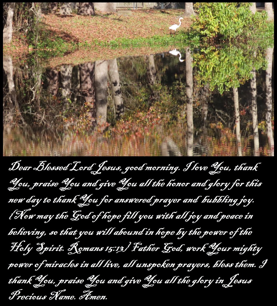 Dear Blessed Lord Jesus, good morning. I love You, thank You, praise You and give You all the honor and glory for this new day to thank You for answered prayer and bubbling joy. {Now may the God of hope fill you with all joy and peace in believing, so that you will abound in hope by the power of the Holy Spirit. Romans 15:13} Father God, work Your mighty power of miracles in all life, all unspoken prayers, bless them. I thank You, praise You and give You all the glory in Jesus Precious Name. Amen.