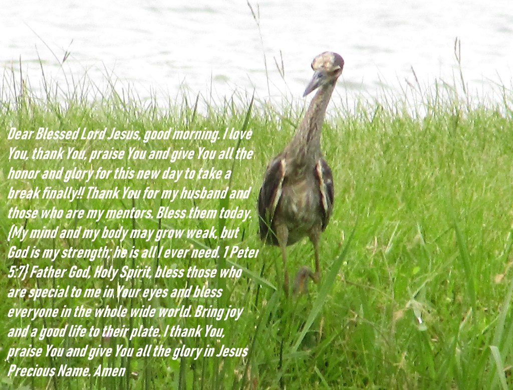 Dear Blessed Lord Jesus, good morning. I love You, thank You, praise You and give You all the honor and glory for this new day to take a break finally!! Thank You for my husband and those who are my mentors. Bless them today. {My mind and my body may grow weak, but God is my strength; he is all I ever need. 1 Peter 5:7} Father God, Holy Spirit, bless those who are special to me in Your eyes and bless everyone in the whole wide world. Bring joy and a good life to their plate. I thank You, praise You and give You all the glory in Jesus Precious Name. Amen.