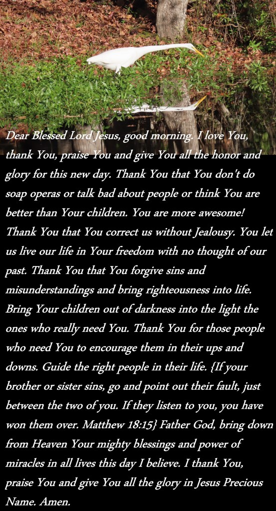 Dear Blessed Lord Jesus, good morning. I love You, thank You, praise You and give You all the honor and glory for this new day. Thank You that You don’t do soap operas or talk bad about people or think You are better than Your children. You are more awesome! Thank You that You correct us without Jealousy. You let us live our life in Your freedom with no thought of our past. Thank You that You forgive sins and misunderstandings and bring righteousness into life. Bring Your children out of darkness into the light the ones who really need You. Thank You for those people who need You to encourage them in their ups and downs. Guide the right people in their life. {If your brother or sister sins, go and point out their fault, just between the two of you. If they listen to you, you have won them over. Matthew 18:15} Father God, bring down from Heaven Your mighty blessings and power of miracles in all lives this day I believe. I thank You, praise You and give You all the glory in Jesus Precious Name. Amen.