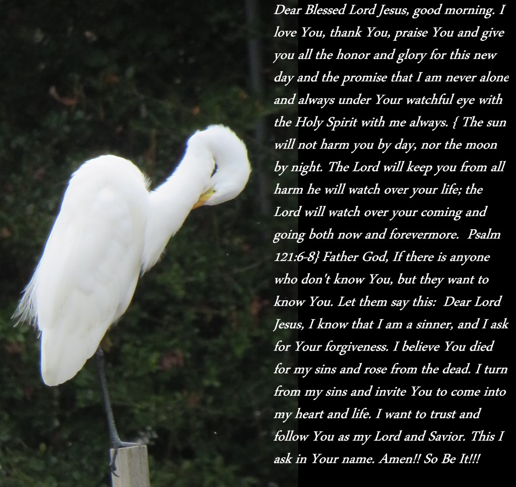 Dear Blessed Lord Jesus, good morning. I love You, thank You, praise You and give you all the honor and glory for this new day and the promise that I am never alone and always under Your watchful eye with the Holy Spirit with me always. { The sun will not harm you by day, nor the moon by night. The Lord will keep you from all harm he will watch over your life; the Lord will watch over your coming and going both now and forevermore. Psalm 121:6-8} Father God, If there is anyone who don’t know You, but they want to know You. Let them say this: Dear Lord Jesus, I know that I am a sinner, and I ask for Your forgiveness. I believe You died for my sins and rose from the dead. I turn from my sins and invite You to come into my heart and life. I want to trust and follow You as my Lord and Savior. This I ask in Your name. Amen!! So Be It!!!