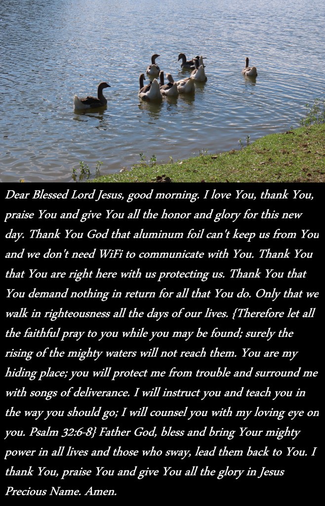 Dear Blessed Lord Jesus, good morning. I love You, thank You, praise You and give You all the honor and glory for this new day. Thank You God that aluminum foil can’t keep us from You and we don’t need WiFi to communicate with You. Thank You that You are right here with us protecting us. Thank You that You demand nothing in return for all that You do. Only that we walk in righteousness all the days of our lives. {Therefore let all the faithful pray to you while you may be found; surely the rising of the mighty waters will not reach them. You are my hiding place; you will protect me from trouble and surround me with songs of deliverance. I will instruct you and teach you in the way you should go; I will counsel you with my loving eye on you. Psalm 32:6-8} Father God, bless and bring Your mighty power in all lives and those who sway, lead them back to You. I thank You, praise You and give You all the glory in Jesus Precious Name. Amen.