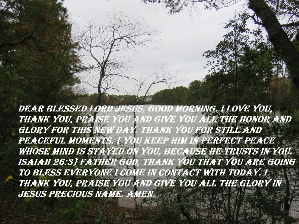 Dear Blessed Lord Jesus, good morning. I love You, thank You, praise You and give You all the honor and glory for this new day. Thank You for still and peaceful moments. { You keep him in perfect peace whose mind is stayed on you, because he trusts in you. Isaiah 26:3} Father God, Thank You that You are going to bless everyone I come in contact with today. I thank You, praise You and give You all the glory in Jesus Precious Name. Amen.