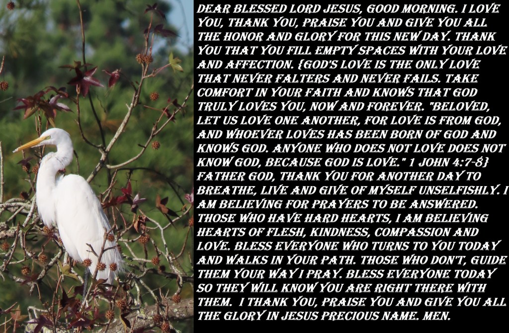 Dear Blessed Lord Jesus, good morning. I love You, thank You, praise You and give You all the honor and glory for this new day. Thank You that You fill empty spaces with Your love and affection. {God’s love is the only love that never falters and never fails. Take comfort in your faith and know that God truly loves you, now and forever. “Beloved, let us love one another, for love is from God, and whoever loves has been born of God and knows God. Anyone who does not love does not know God, because God is love.” 1 John 4:7-8} Father God, Thank You for another day to breathe, live and give of myself unselfishly. I am believing for prayers to be answered. Those who have hard hearts, I am believing hearts of flesh, kindness, compassion and love. Bless everyone who turns to You today and walks in Your path. Those who don’t, guide them Your way I pray. Bless everyone today so they will know You are right there with them. I thank You, praise You and give You all the glory in Jesus Precious Name. men.