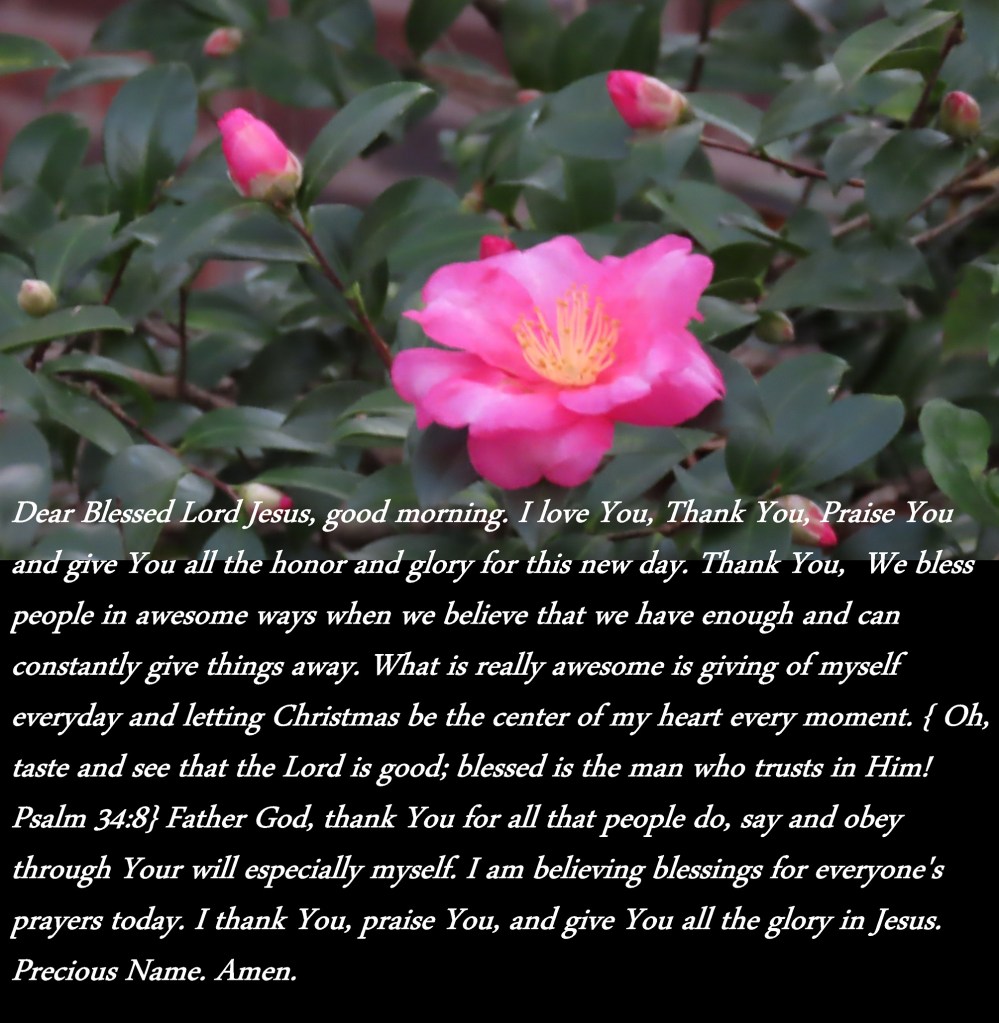 Dear Blessed Lord Jesus, good morning. I love You, Thank You, Praise You and give You all the honor and glory for this new day. Thank You, We bless people in awesome ways when we believe that we have enough and can constantly give things away. What is really awesome is giving of myself everyday and letting Christmas be the center of my heart every moment. { Oh, taste and see that the Lord is good; blessed is the man who trusts in Him! Psalm 34:8} Father God, thank You for all that people do, say and obey through Your will especially myself. I am believing blessings for everyone’s prayers today. I thank You, praise You, and give You all the glory in Jesus. Precious Name. Amen.