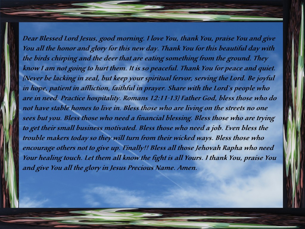 Dear Blessed Lord Jesus, good morning. I love You, thank You, praise You and give You all the honor and glory for this new day. Thank You for this beautiful day with the birds chirping and the deer that are eating something from the ground. They know I am not going to hurt them. It is so peaceful. Thank You for peace and quiet. {Never be lacking in zeal, but keep your spiritual fervor, serving the Lord. Be joyful in hope, patient in affliction, faithful in prayer. Share with the Lord’s people who are in need. Practice hospitality. Romans 12:11-13} Father God, bless those who do not have stable homes to live in. Bless those who are living on the streets no one sees but you. Bless those who need a financial blessing. Bless those who are trying to get their small business motivated. Bless those who need a job. Even bless the trouble makers today so they will turn from their wicked ways. Bless those who encourage others not to give up. Finally!! Bless all those Jehovah Rapha who need Your healing touch. Let them all know the fight is all Yours. I thank You, praise You and give You all the glory in Jesus Precious Name. Amen.