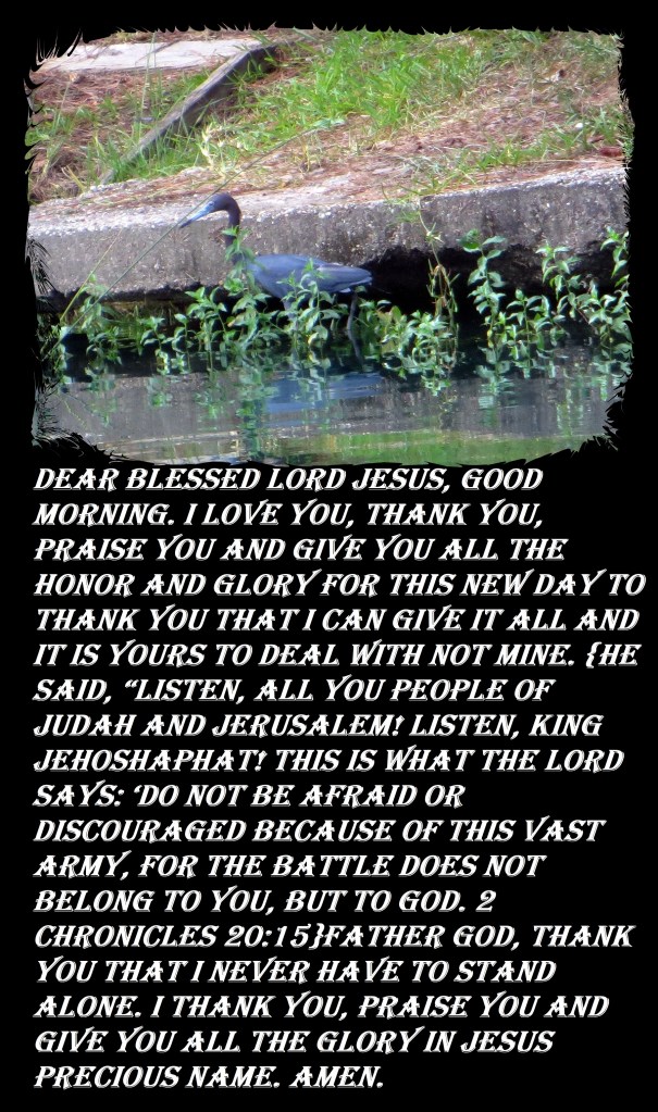 Dear Blessed Lord Jesus, good morning. I love You, thank You, praise You and give You all the honor and glory for this new day to thank You that I can give it all and it is Yours to deal with not mine. {He said, “Listen, all you people of Judah and Jerusalem! Listen, King Jehoshaphat! This is what the LORD says: ‘Do not be afraid or discouraged because of this vast army, for the battle does not belong to you, but to God. 2 Chronicles 20:15}Father God, thank You that I never have to stand alone. I thank You, praise You and give You all the glory in Jesus Precious Name. Amen.