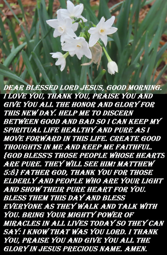 Dear Blessed Lord Jesus, good morning. I love you, thank You, praise You and give You all the honor and glory for this new day. Help me to discern between good and bad so I can keep my spiritual life healthy and pure as I move forward in this life. Create good thoughts in me and keep me faithful. {God bless’s those people whose hearts are pure. They will see Him! Matthew 5:8} Father God, thank You for those elderly and people who are Your light and show their pure heart for You. Bless them this day and bless everyone as they walk and talk with You. Bring Your mighty power of miracles in all lives today so they can say: I know that was You Lord. I thank You, praise You and give You all the glory in Jesus Precious Name. Amen.