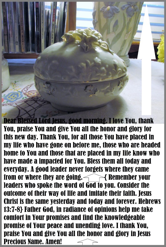 Dear Blessed Lord Jesus, good morning. I love You, thank You, praise You and give You all the honor and glory for this new day. Thank You, for all those You have placed in my life who have gone on before me, those who are headed home to You and those that are placed in my life know who have made a impacted for You. Bless them all today and everyday. A good leader never forgets where they came from or where they are going. { Remember your leaders who spoke the word of God to you. Consider the outcome of their way of life and imitate their faith. Jesus Christ is the same yesterday and today and forever. Hebrews 13:7-8} Father God, in radiance of opinions help me take comfort in Your promises and find the knowledgeable promise of Your peace and unending love. I thank You, praise You and give You all the honor and glory in Jesus Precious Name. Amen!