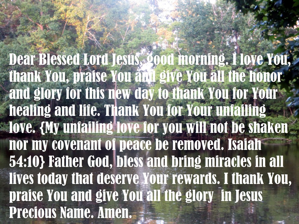 Dear Blessed Lord Jesus, good morning. I love You, thank You, praise You and give You all the honor and glory for this new day to thank You for Your healing and life. Thank You for Your unfailing love. {My unfailing love for you will not be shaken nor my covenant of peace be removed. Isaiah 54:10} Father God, bless and bring miracles in all lives today that deserve Your rewards. I thank You, praise You and give You all the glory in Jesus Precious Name. Amen.