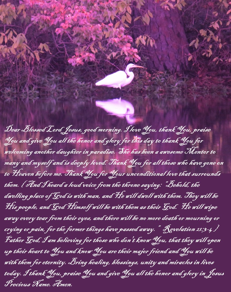 Dear Blessed Lord Jesus, good morning. I love You, thank You, praise You and give You all the honor and glory for this day to thank You for welcoming another daughter in paradise. She has been a awesome Mentor to many and myself and is deeply loved. Thank You for all those who have gone on to Heaven before me. Thank You for Your unconditional love that surrounds them. { And I heard a loud voice from the throne saying: “Behold, the dwelling place of God is with man, and He will dwell with them. They will be His people, and God Himself will be with them as their God. He will wipe away every tear from their eyes, and there will be no more death or mourning or crying or pain, for the former things have passed away.” Revelation 21:3-4 } Father God, I am believing for those who don’t know You, that they will open up their heart to You and know You are their major friend and You will be with them for eternity. Bring healing, blessings, unity and miracles in lives today. I thank You, praise You and give You all the honor and glory in Jesus Precious Name. Amen.