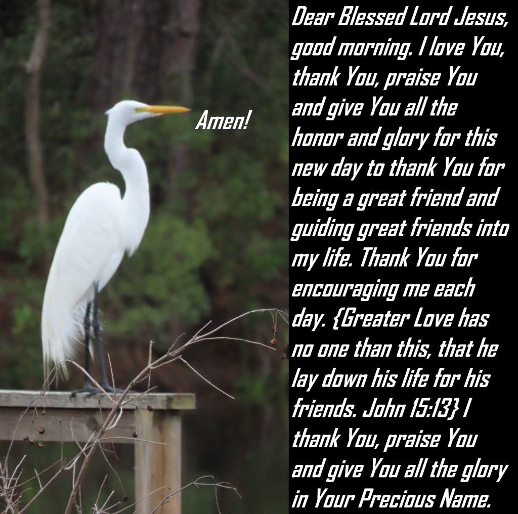 Dear Blessed Lord Jesus, good morning. I love You, thank You, praise You and give You all the honor and glory for this new day to thank You for being a great friend and guiding great friends into my life. Thank You for encouraging me each day. {Greater Love has no one than this, that he lay down his life for his friends. John 15:13} I thank You, praise You and give You all the glory in Your Precious Name. Amen!