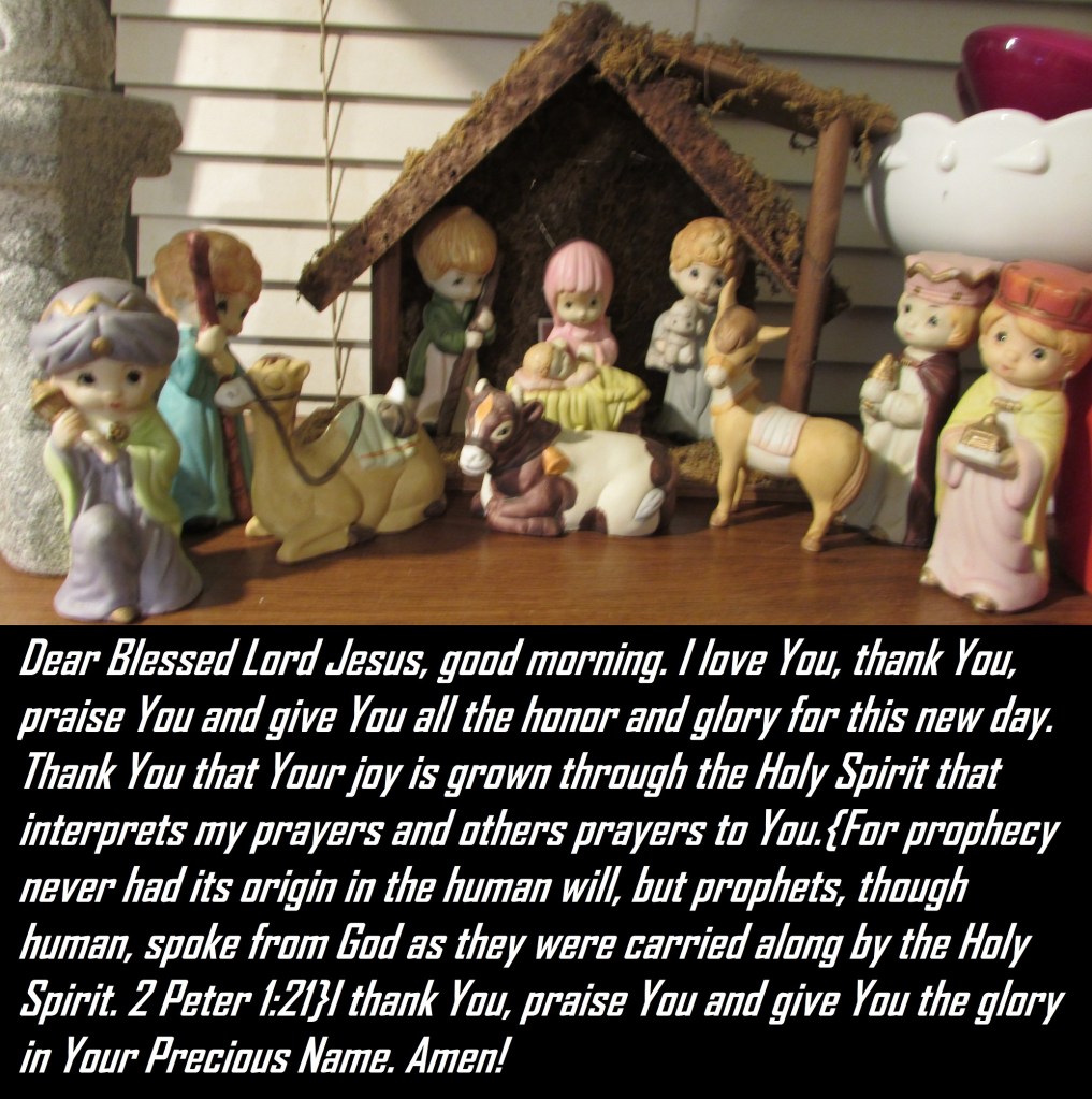 Dear Blessed Lord Jesus, good morning. I love You, thank You, praise You and give You all the honor and glory for this new day. Thank You that Your joy is grown through the Holy Spirit that interprets my prayers and others prayers to You.{For prophecy never had its origin in the human will, but prophets, though human, spoke from God as they were carried along by the Holy Spirit. 2 Peter 1:21}I thank You, praise You and give You the glory in Your Precious Name. Amen!