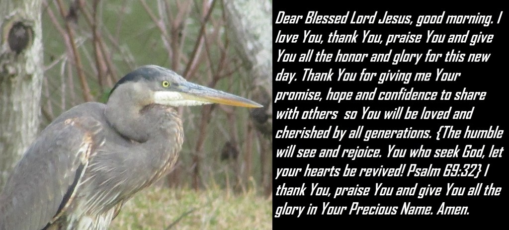 Dear Blessed Lord Jesus, good morning. I love You, thank You, praise You and give You all the honor and glory for this new day. Thank You for giving me Your promise, hope and confidence to share with others so You will be loved and cherished by all generations. {The humble will see and rejoice. You who seek God, let your hearts be revived! Psalm 69:32} I thank You, praise You and give You all the glory in Your Precious Name. Amen.