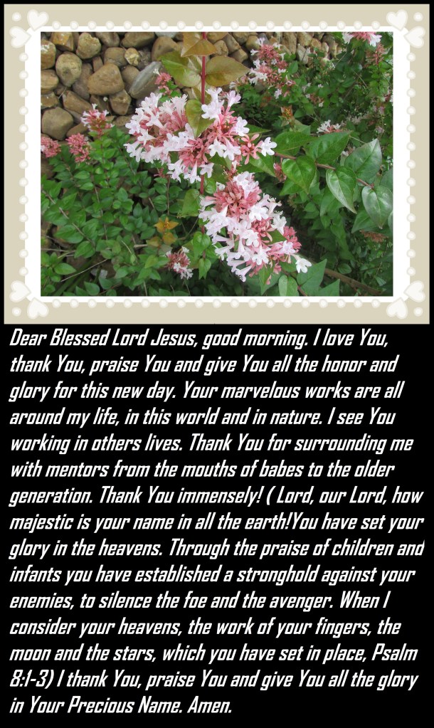 Dear Blessed Lord Jesus, good morning. I love You, thank You, praise You and give You all the honor and glory for this new day. Your marvelous works are all around my life, in this world and in nature. I see You working in others lives. Thank You for surrounding me with mentors from the mouths of babes to the older generation. Thank You immensely! ( Lord, our Lord, how majestic is your name in all the earth!You have set your glory in the heavens. Through the praise of children and infants you have established a stronghold against your enemies, to silence the foe and the avenger. When I consider your heavens, the work of your fingers, the moon and the stars, which you have set in place, Psalm 8:1-3) I thank You, praise You and give You all the glory in Your Precious Name. Amen.