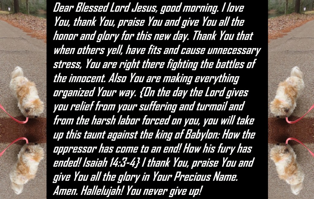 Dear Blessed Lord Jesus, good morning. I love You, thank You, praise You and give You all the honor and glory for this new day. Thank You that when others yell, have fits and cause unnecessary stress, You are right there fighting the battles of the innocent. Also You are making everything organized Your way. {On the day the Lord gives you relief from your suffering and turmoil and from the harsh labor forced on you, you will take up this taunt against the king of Babylon: How the oppressor has come to an end! How his fury has ended! Isaiah 14:3-4} I thank You, praise You and give You all the glory in Your Precious Name. Amen. Hallelujah! You never give up!